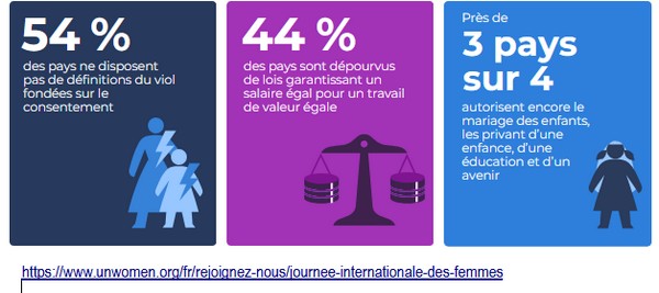Selon l’ONU, Les droits des femmes ne signifient rien si nous ne pouvons pas les défendre. Or, les femmes et les filles ne disposent que de 64 % des droits légaux dont jouissent les hommes.